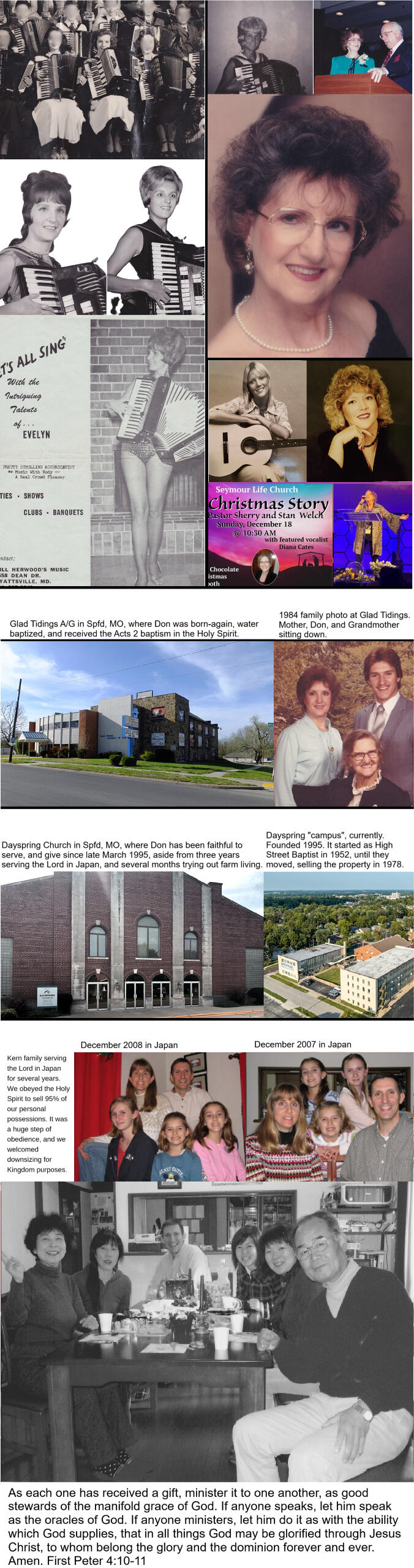 Don was raised in a musical family. His mother Evelyn was professional in the accordion before she was 20 years old. She trained as a young teen at the Guild Institute of Music in Washington, D.C., in the 1940s. Evelyn sang as a soloist with her accordion at the start of her music career, and transitioned to the cordovox as lead singer in small ensembles at nightclubs, bars, and congressional events in and around D.C., including the suburbs of Maryland, and Virginia. Don used to travel from time to time with his mom when he was 9 to 11-yrs old, only singing a time or two. When his mom wanted to teach him piano, Don preferred to play sports at the local boys club as a youth. Any music gifts Don had been given by God remained dormant for years.In the early 1970s, through much intercessory prayer by Evelyn’s father, mother, and others, Evelyn had an encounter with Jesus, rededicating her life to Christ since her first confession of faith as a 12-year old child in 1946. She became a member of Trinity Assembly of God in Lanham, MD. Surrendering the music gifts God had given her to the Lord for Christian ministry, she then relocated with Don, the youngest child of her six children, to Springfield, MO, in summer 1977.Evelyn obtained a sacred music degree from Central Bible College while working full-time as a typesetter and proofreader for Gospel Publishing House of the Assemblies of God, retiring after 17 years with GPH. She could play anything with keys: piano, organ, accordion, or synthesizer keyboard. Evelyn served as church pianist, church organist, and accompanied her daughter, Diana (an accomplished Gospel songwriter and singer), at some Gospel events. Diana Hurd Cates (Don’s sister), has been active in Christian music ministry for over 50 years, recording several Gospel songs and full album projects, serving or leading worship at various churches, and ministering at women’s conferences.Through months of intercessory prayer by the women’s prayer group Evelyn attended at Glad Tidings Assembly of God in Springfield, Don did receive Jesus as Savior, was born-again December 1980, and water baptized in March 1981 at Glad Tidings Assembly of God, Springfield, MO. Don also received the Acts 2 baptism in the Holy Spirit under Evangelist Tom Waggoner’s ministry in spring 1981.After falling out of fellowship, backsliding into sin through his college years, Don had a radical re-encounter with Jesus in December 1987, not even seeking to come out of sin, and return to the Lord. Once again, it was God answering the prayers of his mother, grandmother, sister, brother-in-law, and others. This awakening by God in Don started a new walk of holiness, sanctification, and depth of relationship with the Father, Son, and Holy Spirit, with instant deliverance from alcohol abuse and sexual immorality. Don became an intimate worshiper of God, with many hours in the secret place from age 24 to today, growing in the grace and knowledge of Jesus Christ with fasting, prayer, study of the Word, praise and worship, faithfully all these years. He has been faithful to a local non-denominational congregation, Dayspring Church in Springfield, since March 1995, serving as a missionary in Japan for three years (2007 to 2010).In fall 2019, at age 56, the Holy Spirit impressed upon Don to get a vocal coach. Since Don wasn’t a singer, and any music gifts from God were very dormant, he was puzzled. Calling his sister, Diana, she said something to the effect that “it is never too late to move into what God has for you, as I always knew you had a music gift from God.” When the decision was made to get a vocal coach, the Holy Spirit started impressing on Don that He had a Gospel version of such and such song from his younger days. Like a prophetic word, the new Gospel lyrics flow almost effortlessly in the Spirit, fitting the syllable count of the original song, and producing a rhyming pattern with the particular message from God intended for the new, transformative work.It helps to already have a teaching gift in regard to the Bible, as years of study allow for recall of specific Gospel content that is utilized in the lyrics. Over 100 sets of lyrics, and counting, have been received by Don from the Holy Spirit so far. It is an incredible work of God’s grace for such a time as this, the dormant gift of God awakened as a lyricist and vocalist for the glory of God. The purposes are for the Gospel message to go forth in song as both an educational tool and ministry tool, along with testimonies of God’s goodness to encourage others, sound teaching of the Word of God to make disciples of Jesus, and reliance on the Holy Spirit to do His part to change everyone who yields to Him at every ministry opportunity.The end time indications are all around us more than ever if your spiritual eyes are open, so we must be about the Father’s business, shedding the cares of life as much as possible to be fruitful in the Word, as we surrender our hearts and allow His Spirit to lead us. Don will do his part as a harvest worker to feed Jesus' sheep with edification in love, encourage the Body of Christ, see the backslidden prodigals restored to intimacy with Jesus, see lost souls saved, and disciples of Jesus made. And all for the Glory of God.